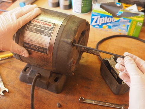 There were a few reasons we decided to restore the motor. Mainly, the pulley on the motor’s shaft was secured with a set screw. Over time, this set screw just kept getting tightened and tightened, ruining the shaft of the motor. The motor had two shafts, but the other would be going in the wrong direction. To switch the direction, we planned to flip some wires around inside the motor. Also, the motor sounded horrible because the bearings in it were old and ruined. Finally, the motor was really dirty and dusty.