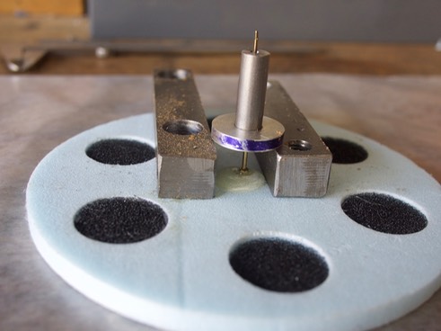 Using an old soldering iron, I melted a circle into the foam to act as a well for the epoxy. (pictured: practicing)